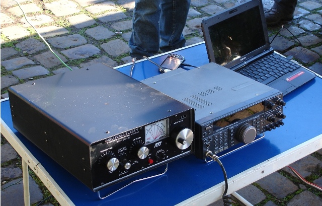 Estuvimos presente en la plataforma TeamSpeak usando el software v2 para Linux. Se usó un netbook Toshiba NB-305 cuya conexión a Internet la entregó un teléfono inteligente Samsung Galaxy 550 en modalidad de Zona Portátil Wifi. La siguiente imagen muestra parte del equipamiento en terreno:
