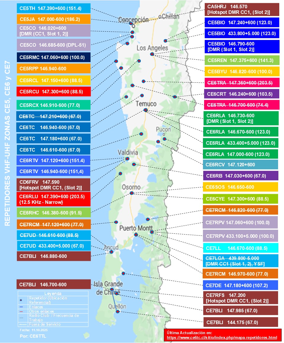 Nuestro Socio Ruben CE6TTL nos presenta un mapa con las frecuencias de los repetidores y Link de la zona 5, 6 y 7. Revisar periódicamente esta pagina pues se irá actualizando: https://www.ce6tc.cl/sitio/index.php/mapa-repetidores.html Si faltan frecuencias o si hay que corregir alguna le pueden escribir a su correo Esta dirección electrónica esta protegida contra spam bots. Necesita activar JavaScript para visualizarla |
